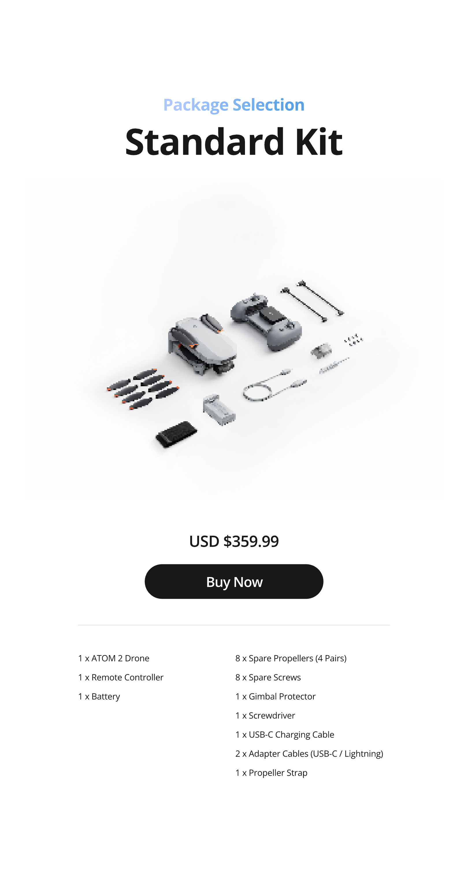 1 x ATOM 2 Drone / 1 x Remote Controller / 1 x Battery / 8 x Spare Propellers (4 Pairs) / 8 x Spare Screws / 1 x Gimbal Protector / 1 x Screwdriver / 1 x USB-C Charging Cable / 2 x Adapter Cables (USB-C / Lightning Connector) / 1 x Propeller Strap